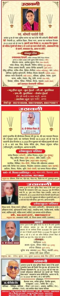 आगरालीक्स:…आगरा में आज उठावनी, आगरालीक्स पर उठावनी प्रकाशित कराने के लिए कॉल करें 999794214
