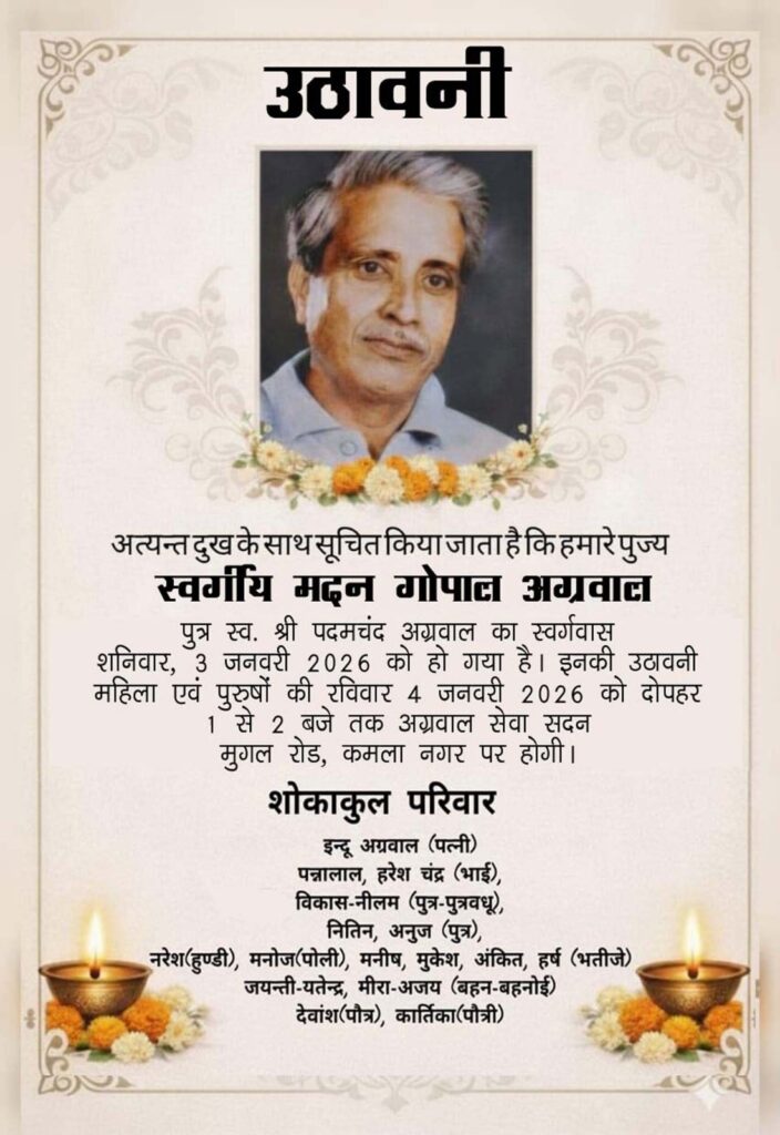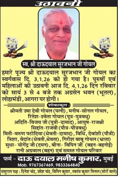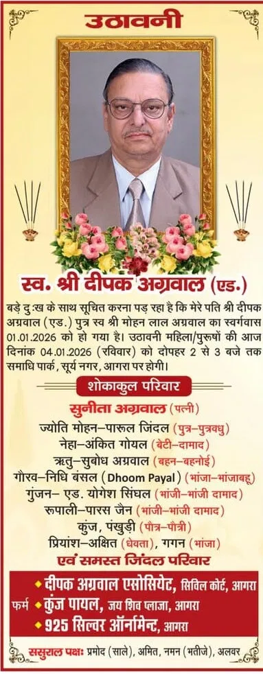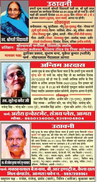 आगरालीक्स:……आगरा में आज उठावनी, शवयात्रा, आगरालीक्स पर उठावनी प्रकाशित कराने के लिए कॉल करें 9997942147