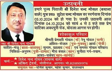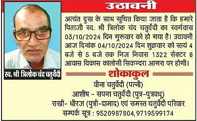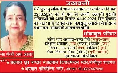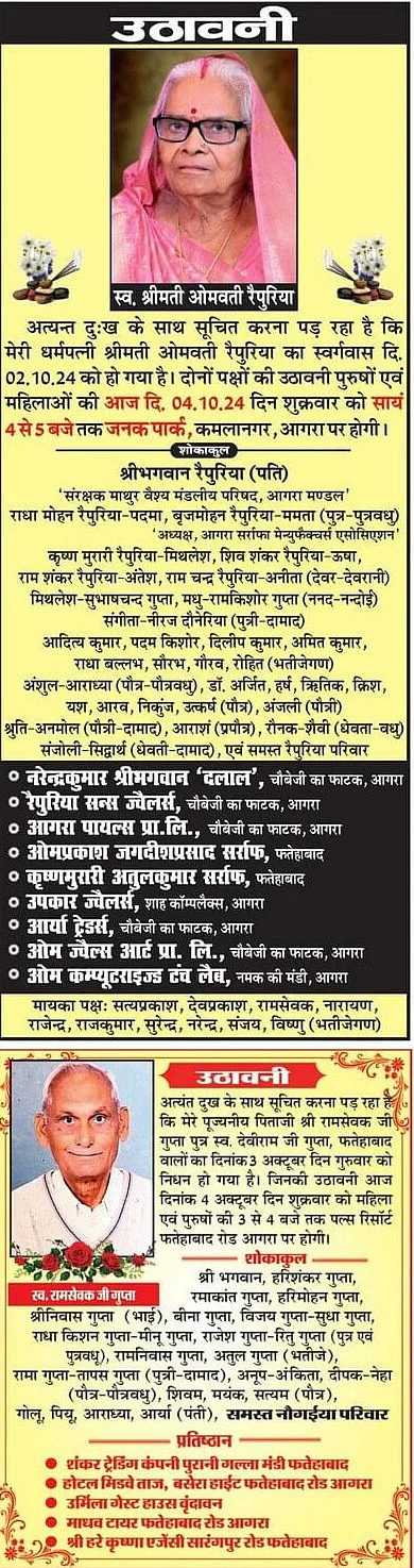 आगरालीक्स.. आगरा में आज 4 अक्टूबर 2024 को उठावनी और शोकसभा, आगरालीक्स पर उठावनी प्रकाशित कराने के लिए काॅल करें. 9997942147