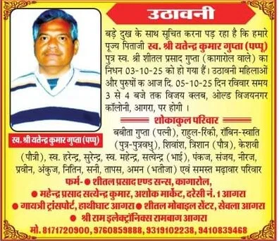 आगरालीक्स:…आगरा में आज उठावनी, शवयात्रा, आगरालीक्स पर उठावनी प्रकाशित कराने के लिए कॉल करें 9997942147