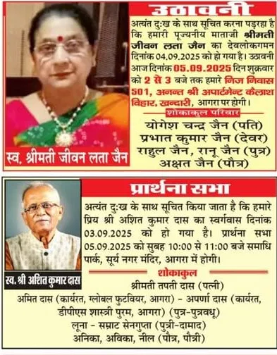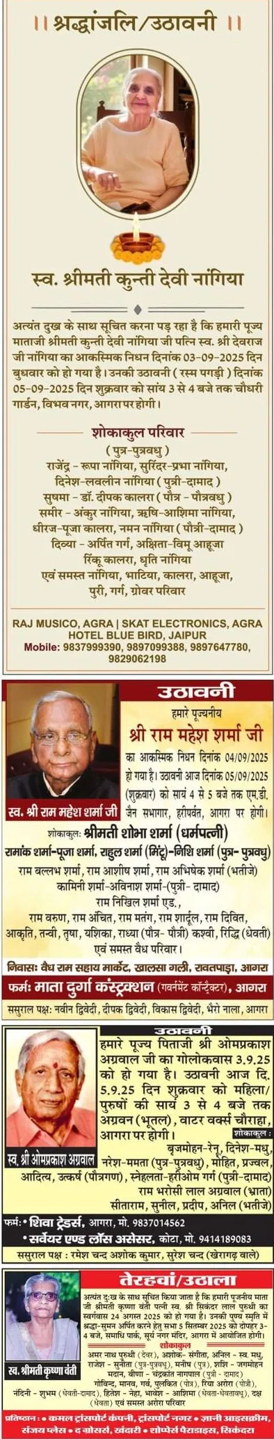 आगरालीक्स:…आगरा में आज उठावनी, शवयात्रा, आगरालीक्स पर उठावनी प्रकाशित कराने के लिए कॉल करें 9997942147