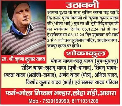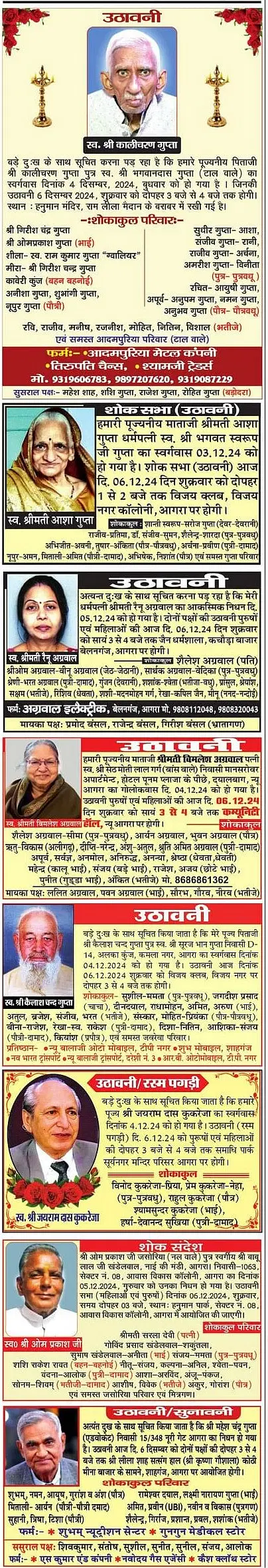आगरालीक्स.. आगरा में आज 6 दिसंबर को 2024 को उठावनी और शोकसभा, आगरालीक्स पर उठावनी प्रकाशित कराने के लिए काॅल करें. 9997942147