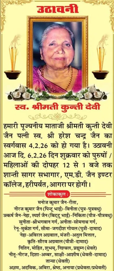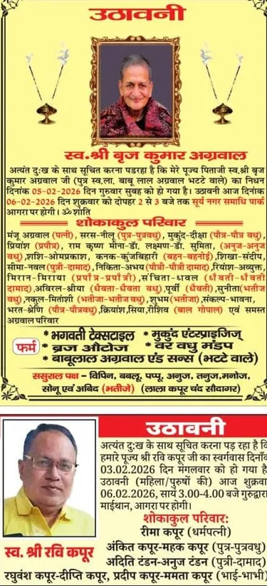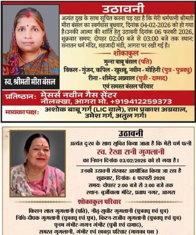 आगरालीक्स:……आगरा में आज उठावनी, शवयात्रा, आगरालीक्स पर उठावनी प्रकाशित कराने के लिए कॉल करें 999794214