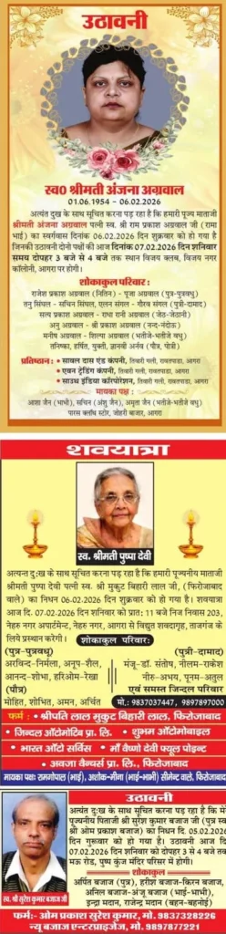 Home आगरा Obituaries of Agra on 7th February 2026
