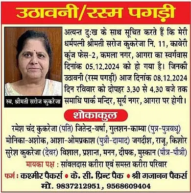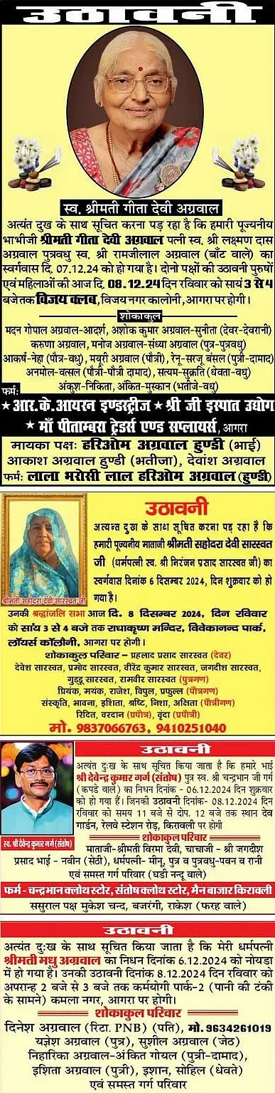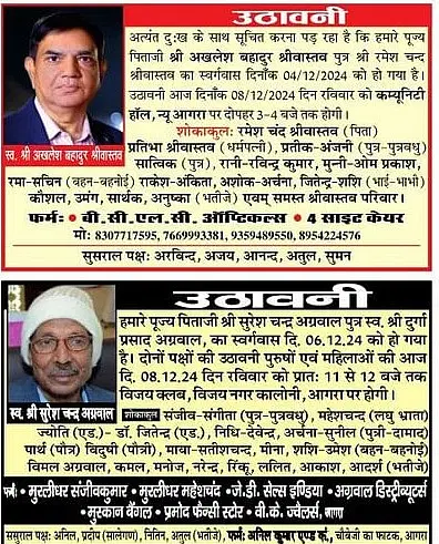 आगरालीक्स.. आगरा में आज 8 दिसंबर को 2024 को उठावनी और शोकसभा, आगरालीक्स पर उठावनी प्रकाशित कराने के लिए काॅल करें. 9997942147