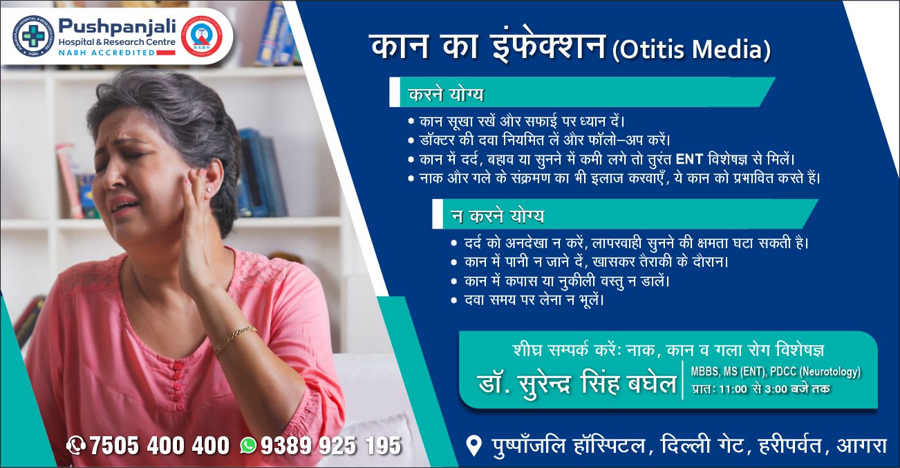 आगरालीक्स…कान के लगातार दर्द को अनदेखा न करें. आगरा के पुष्पांजलि हॉस्पिटल मेें डॉ. सुरेंद्र सिंह बघेल से लें परामर्श. संपर्क करें 7505400400, 9389925195