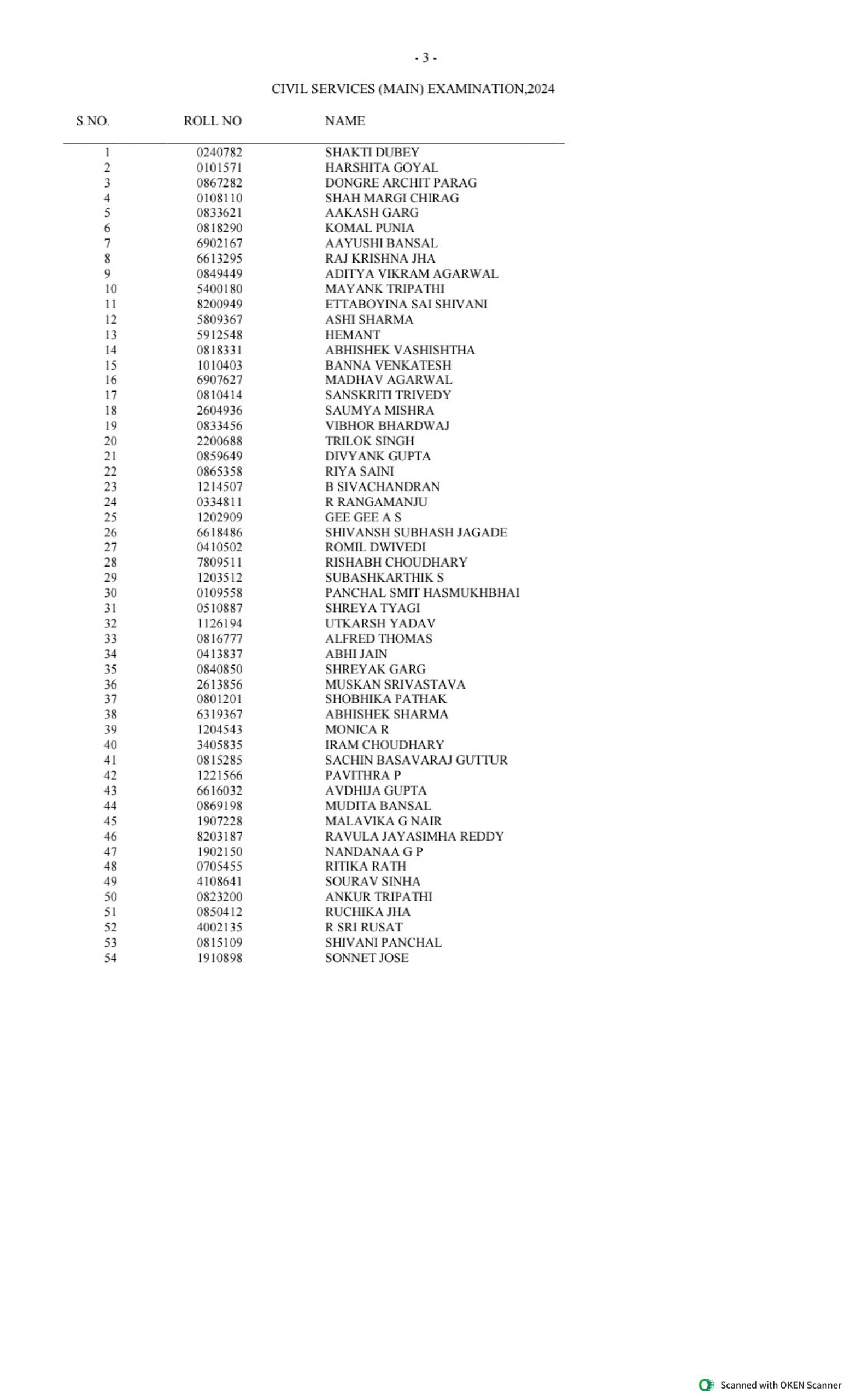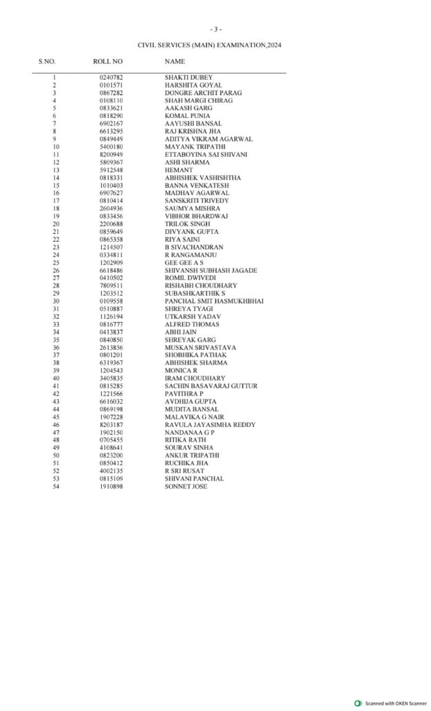 यूपीएससी द्वारा सिविल सेवा परीक्षा 2024 आयोजित की गई थी, 1129 पदों के लिए आयोजित की गई परीक्षा में 1009 चयनित अभ्यर्थियों की सूची जारी की गई है। प्रयागराज की शक्ति दुबे ने टॉप किया है।