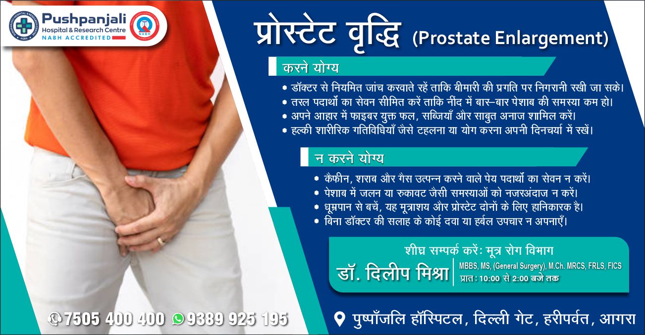 प्रोस्टेट का बढ़ना, जिसे सौम्य प्रोस्टेट हाइपरप्लासिया (BPH) कहते हैं, 50 वर्ष से अधिक उम्र के पुरुषों में एक आम समस्या है, जो अक्सर उम्र बढ़ने और हार्मोन के असंतुलन के कारण होती है। इसके लक्षणों में बार-बार पेशाब आना, पेशाब करने की तीव्र इच्छा, कमजोर मूत्र धारा और पेशाब शुरू होने में देरी शामिल हैं। उपचार में जीवनशैली में बदलाव, दवाएं या, कुछ मामलों में, सर्जरी शामिल हो सकती है, खासकर अगर लक्षण गंभीर हों या जटिलताएं हों। अगर आप भी इस समस्या के शिकार हैं और बेहतर इलाज चाहते हैं तो पुष्पांजलि हॉस्पिटल एंड रिसर्च सेंटर में मूत्र रोग विभाग डॉ. दिलीप मिश्रा से प्रात: 10:00 से 2:00 बजे तक परामर्श ले सकते हैं.