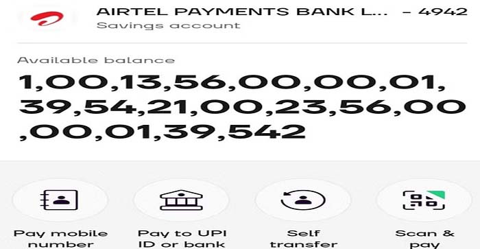 आगरा से सटे हाथरस जिले में एक किसान के खाते में इतनी रकम आई कि उसके होश उड़ गए. रकम इतनी डिजिट में थी कि उसे गिनने में अच्छे—अच्छों के पसीने छूट जाएं. किसान के खाते में जब 100135600000139542100235600000139542 रुपये बैलेंस दिखा तो उसके होश उड़ गए. किसान ने इसकी शिकायत साइबर पुलिस और एयरटेल पैमेंट बैंक में जाकर की जिसके बाद किसान के खाते को फ्रीज कर दिया गया है.सादाबाद की ग्राम पंचायत मिढ़ावली के गांव नगला दुर्जिया में रहने वाले किसान अजीत सिंह के एयरटेल पेमेंट बैंक खाते मेंयह रकम आ गई. खाते में इतनी रकम देखकर किसान खुद इसे गिन नहीं पायाऔर सीधा सादाबाद कोतवाली पहुंचा और इसकी जानकारी दी. किसान ने बताया कि उनके एयरटेल पेमेंट बैंक के खाते से 1800 रुपये की रकम गायब हो गई. दूसरे दिन जब बैलेंसचेककिया तो देखा इतनी बड़ी रकम आ चुकी है. उन्होंने बताया कि उन्हें किसी साइबर अपराधी द्वारा फंसाने की कोशिश की जा रही है. अजीत ने इसकी शिकायत एयरटेल पेमेंट बैंक के कस्टमर केयर पर भी की है. जिसके बाद खाते को फ्रीज कर दिया गया है. साइबर सेल में भी आनलाइन शिकायत की गई है. पुलिसका कहना है कि मामला साइबर क्राइम से जुड़ा है. वहीं बैंक अधिकारियों का कहना है कि यह एक टेक्निकल गड़बड़ी हो सकती है.