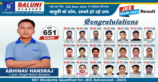 ByAgraleaks TeamApril 19, 2025आगरालीक्स…जेईई मेंस में बलूनी क्लासेस के छात्रों ने मारी बाजी. अभिनव की 651वीं रैंक, रुद्र जैन के 99.48 पर्सेंटाइल…. (adsbygoogle = window.adsbygoogle ||...