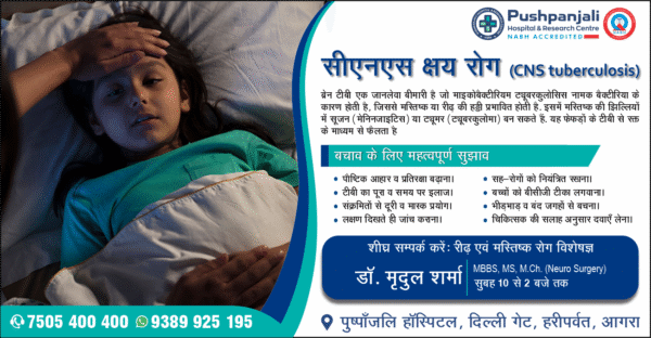आगरालीक्स…सीएनएस क्षय रोग यानी ब्रेन टीबी, एक जानलेवा बीमारी. पुष्पांजलि हॉस्पिटल में डॉ. मृदुल शर्मा से लें परामर्श. संपर्क करें 7505400400, 9389925195 सीएनएस...