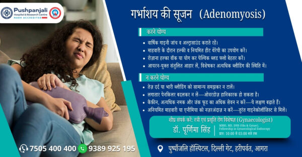 आगरालीक्स…गर्भाशय की सूजन से हैं परेशान. आगरा के पुष्पांजलि हॉस्पिटल में स्त्री एवं प्रसूति रोग विशेषज्ञ डॉ. पूर्णिमा सिंह से लें परामर्श. संपर्क...