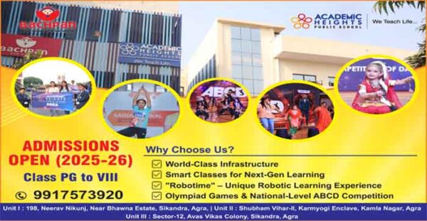 आगरालीक्स…आगरा के भावना एस्टेट, सिकंदरा स्थित बचपन और एकेडेमिक हाईट्स पब्लिक स्कूल की दोनों यूनिट में सत्र 2025—26 के लिए एडमिशन शुरू. जानें...