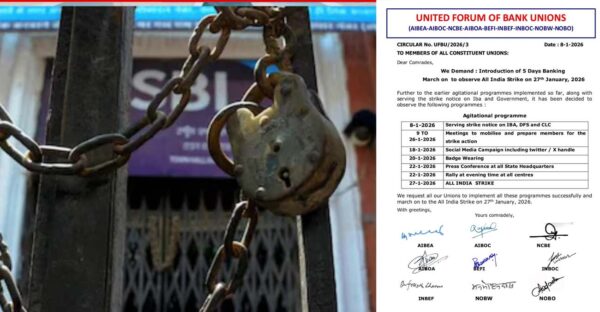 ByAgraleaks TeamJanuary 9, 2026आगरालीक्स…सप्ताह में पांच दिन कार्य को लेकर आगरा सहित देशभर में 27 जनवरी को बैंककर्मियों की हड़ताल का ऐलान. चार दिन तक कामकाज...