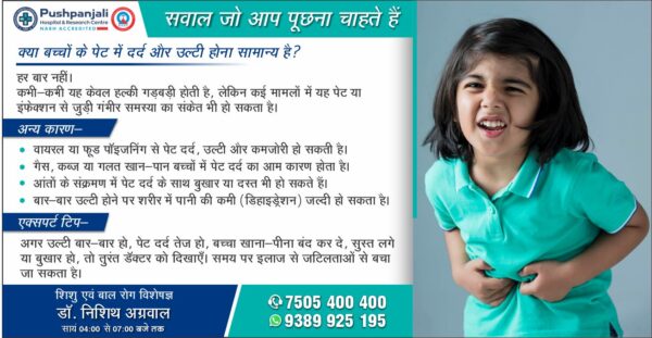 आगरालीक्स…बच्चों के पेट में दर्द और बार—बार उल्टी होने पर पुष्पांजलि हॉस्पिटल में डॉ. निशिथ अग्रवाल से लें परामर्श. संपर्क करें 7505400400, 9389925195...