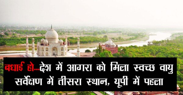 आगरालीक्स…बधाई हो आगरावासियों, स्वच्छ वायु सर्वेक्षण आगरा को देश में मिला तीसरा स्थान. यूपी में टॉप पर रहा. मिलेगा 25 लाख का इनाम...