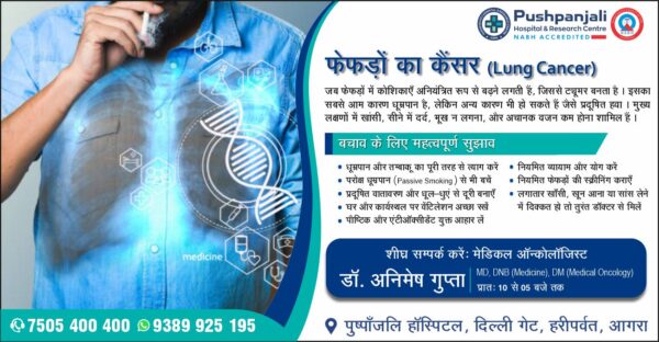 आगरालीक्स…फेफड़ों का कैंसर, इसका सबसे आम कारण धूम्रपान. पुष्पांजलि हॉस्पिटल में बेहतर उपचार के लिए डॉ. अनिमेष गुप्ता से लें परामर्श.. संपर्क करें...