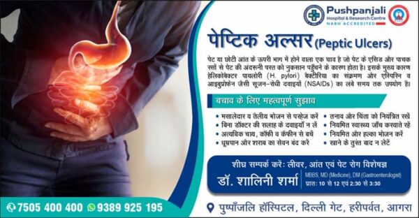 आगरालीक्स…पेप्टिक अल्सर—पेट या छोटी आंत पर होने वाला एक घाव. पुष्पांजलि हॉस्पिटल में लीवर, आंत एवं पेट रोग विशेषज्ञ डॉ. शालिनी शर्मा से...