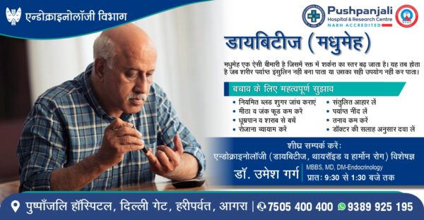 आगरालीक्स…मधुमेह यानी डायबिटीज को हल्के में न लें. पुष्पांजलि हॉस्पिटल में एंडोक्राइनोलॉजी विशेषज्ञ डॉ. उमेश गर्ग से लें परामर्श. संपर्क करें — 7505400400,...