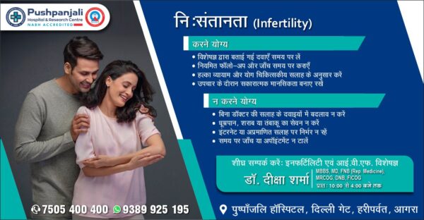 आगरालीक्स…निःसंतानता (Infertility)—आगरा के पुष्पांजलि हॉस्पिटल में इनफर्टिलिटी एवं आई.वी.एफ. विशेषज्ञ डॉ. दीक्षा शर्मा से लें परामर्श. संपर्क करें 7505400400, 9389925195 निःसंतानता (Infertility) वह...