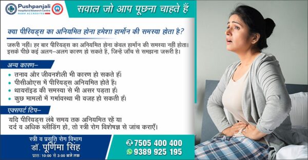 आगरालीक्स…अनियमित पीरियड्स के कारण जानें और बेहतर उपचार के लिए पुष्पांजलि हॉस्पिटल में डॉ. पूर्णिमा सिंह से लें परामर्श. संपर्क करें 7505400400, 9389925195...