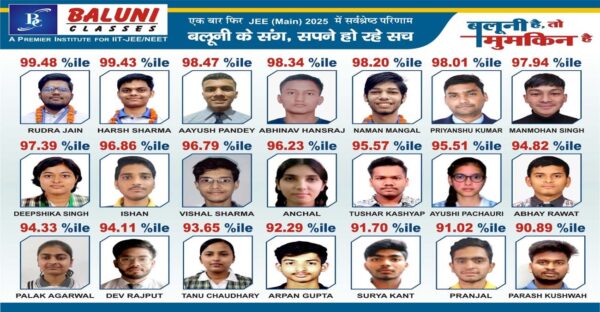 आगरालीक्स…आगरा के बलूनी क्लासेस के छात्र रुद्र जैन और आयुष पांडेय ने जेईई मेन में मारी बाजी, 99.48 और 99.43 पर्सेंटाइल प्राप्त किए।...