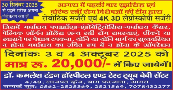 आगरालीक्स… आगरा में गर्भाशय में फाइब्राएड (गांठे) एंडोमेट्रियोसिस, गर्भाशय कैंसर, पेल्विक आर्गन प्रोलैप्स, छींकने पर पेशाब का रिसाव सहित अन्य समस्याओं की पहली...