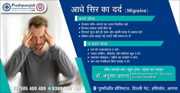 आगरालीक्स…आधे सिर का दर्द (Migraine). धड़कता हुआ दर्द सहना होता है मुश्किल. पुष्पांजलि हॉस्पिटल में डॉ. अनुराग आनन्द से लें परामर्श. संपर्क करें...