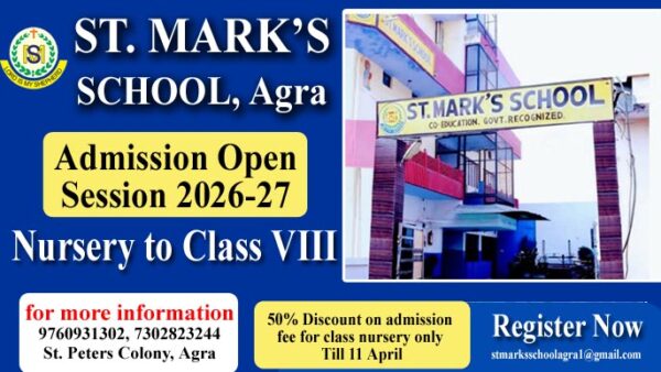 आगरालीक्स…आगरा के सेंट मार्क्स स्कूल में सत्र 2026-27 के लिए एडमिशन शुरू. नर्सरी से कक्षा 8वीं तक के लिए करें एप्लाई. कक्षा नर्सरी...