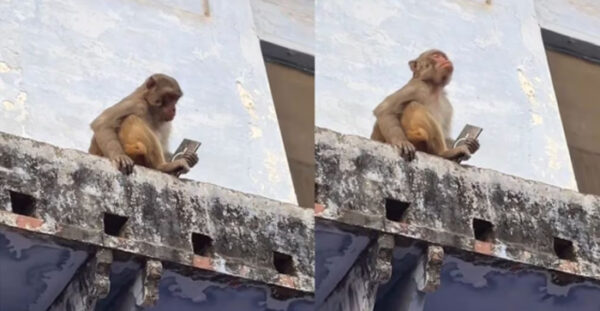 Viral Video: A monkey snatched a mobile phone worth Rs. 1.5 lakh from a devotee in Vrindavan…#mathuranews