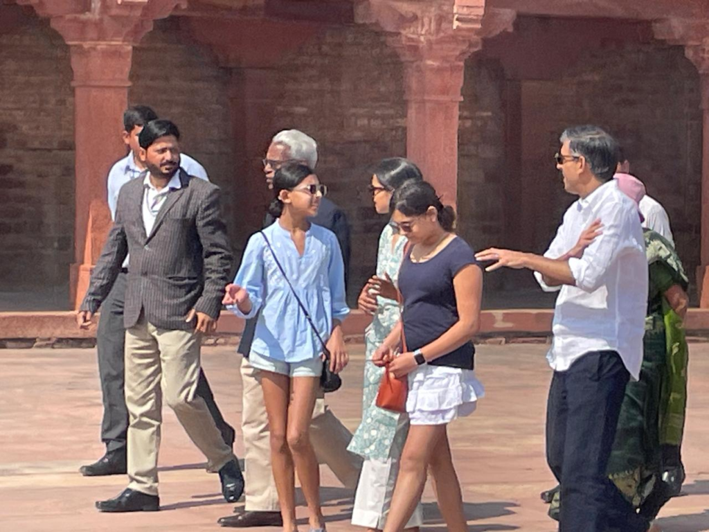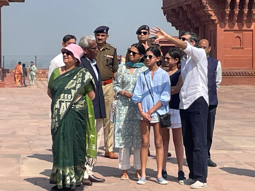 ब्रिटेन के पूर्व प्रधानमंत्री ऋषि सुनक अपनी पत्नी अक्षिता मूर्ति, दोनेां बेटियां और सास सुधा मूर्ति के साथ रविवार को फतेहपुर सीकरी देखने के लए पहुंचे. यहां गाइड शमसुद्दीन ने उन्हें दीवाने आम, दीवाने खास, खजाना महल, ज्योतिष पीठ, चौपड़, पंचमहल ,अनूप तालाब, ख्वाब गाह,तुर्की सुल्ताना, जोधावाई पैलेस, बीरबल पैलेस समेत कई स्मारकों के संबंध में जानकारी दी।