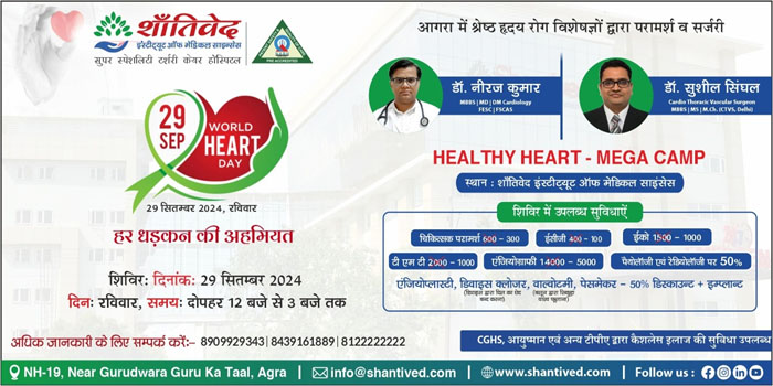 आगरालीक्स ..Agra News : आगरा में विश्व हृदय दिवस पर शांतिवेद इंस्टीट्यूट ऑफ मेडिकल साइंसेज, एनएच 19 गुरुद्वारा गुरु का ताल के पास हृदय जांच शिविर। वरिष्ठ हृदय रोग विशेषज्ञ डॉ. नीरज कुमार और डॉ. सुशील सिंघल कार्डियो थोरेसिक वैस्कुलर सर्जन द्वारा परामर्श दिया जाएगा। हृदय संबंधी पर जांचों पर विशेष छूट की सुविधा।